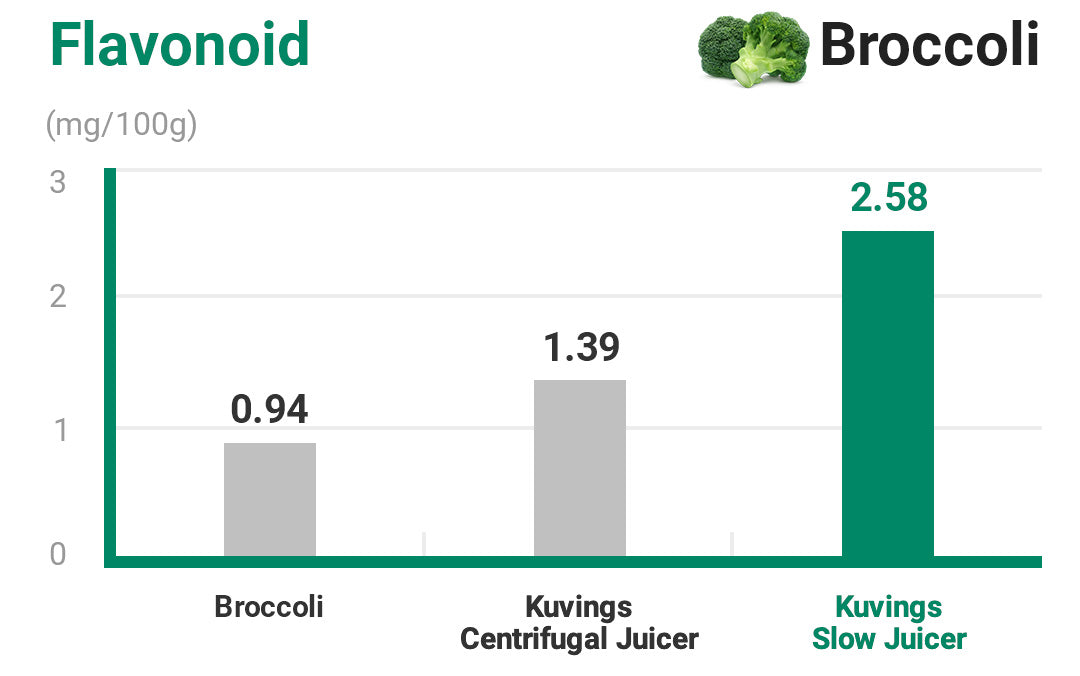 플라보노이드 : 저속 주서로 만든 주스는 원심 분리 주서로 만든 과일과 주스보다 플라보노이드가 1.5배 더 많이 들어 있습니다.