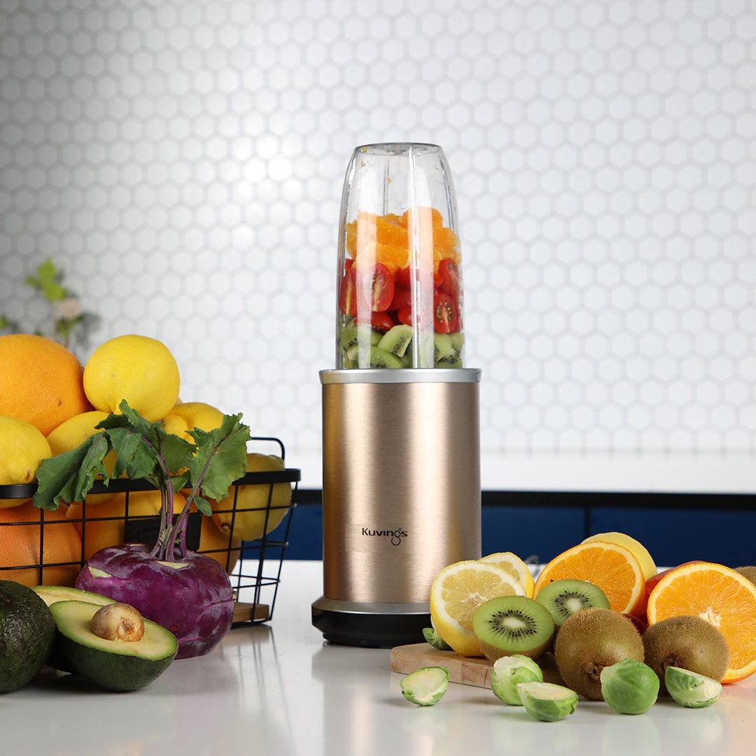 Your compact Kuvings Nutri Blender for premium juice. Packed with a 1,000W motor and sleek metal design, it effortlessly blends delicious, nutrient-rich drinks. Enjoy on-the-go convenience with its portable size and BPA-free materials.